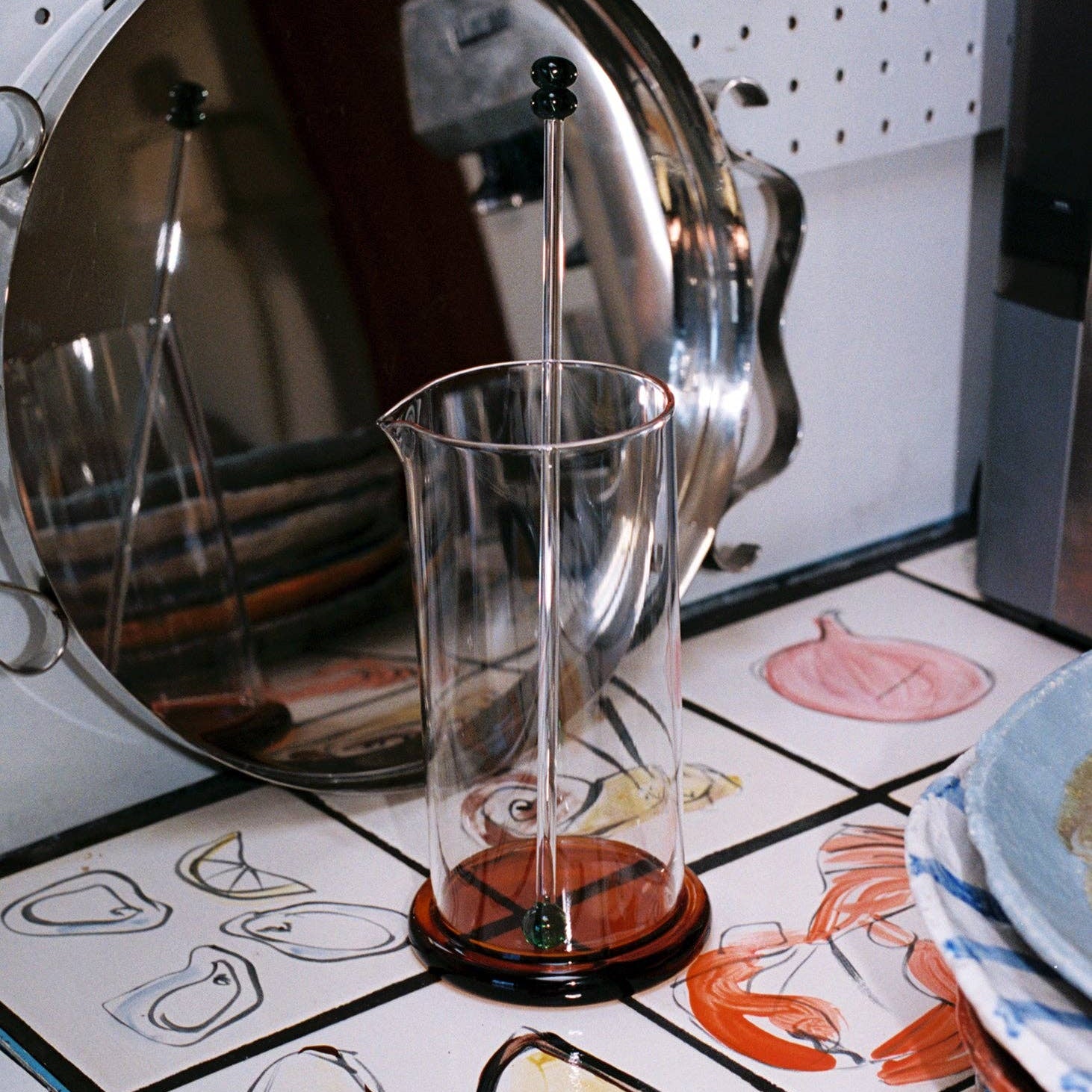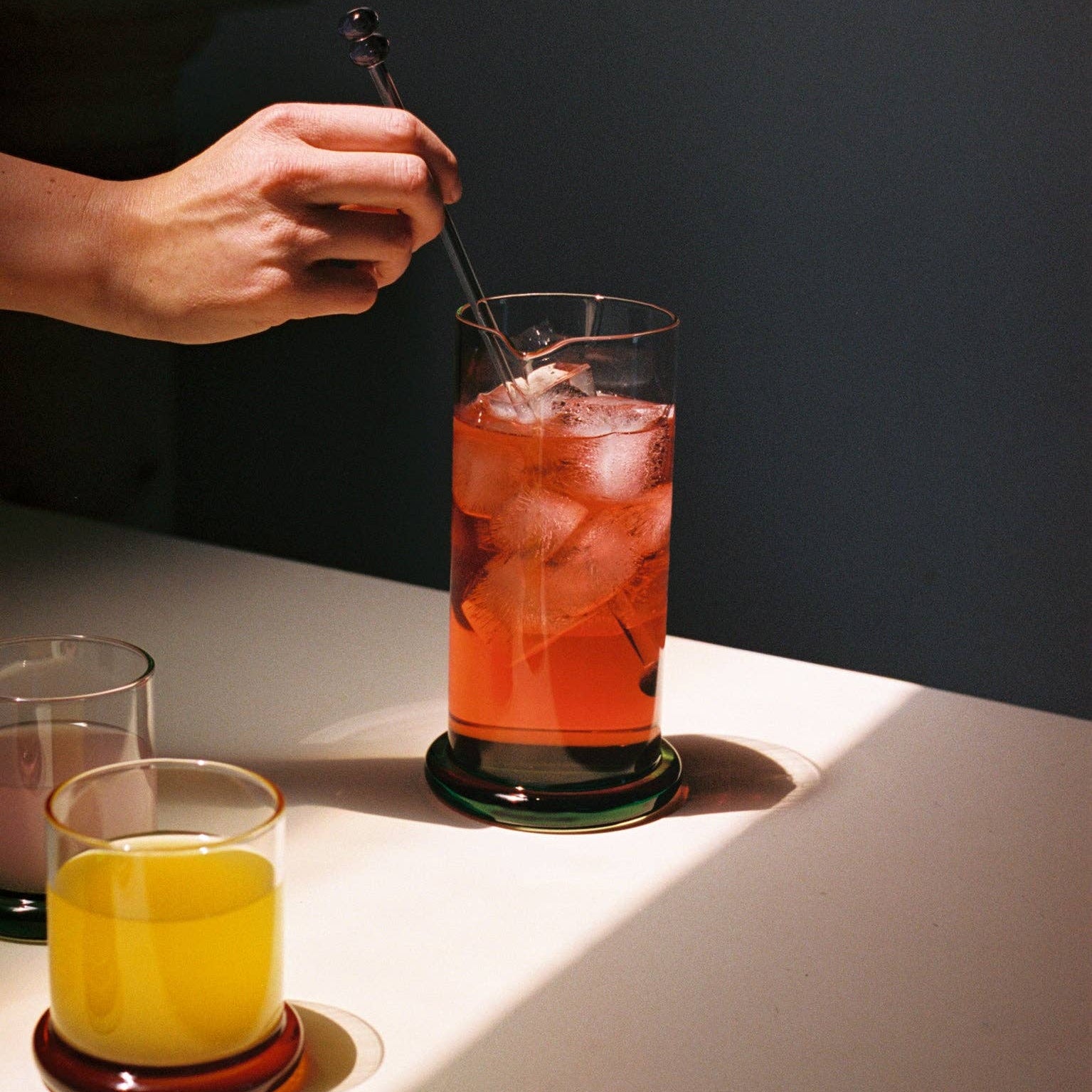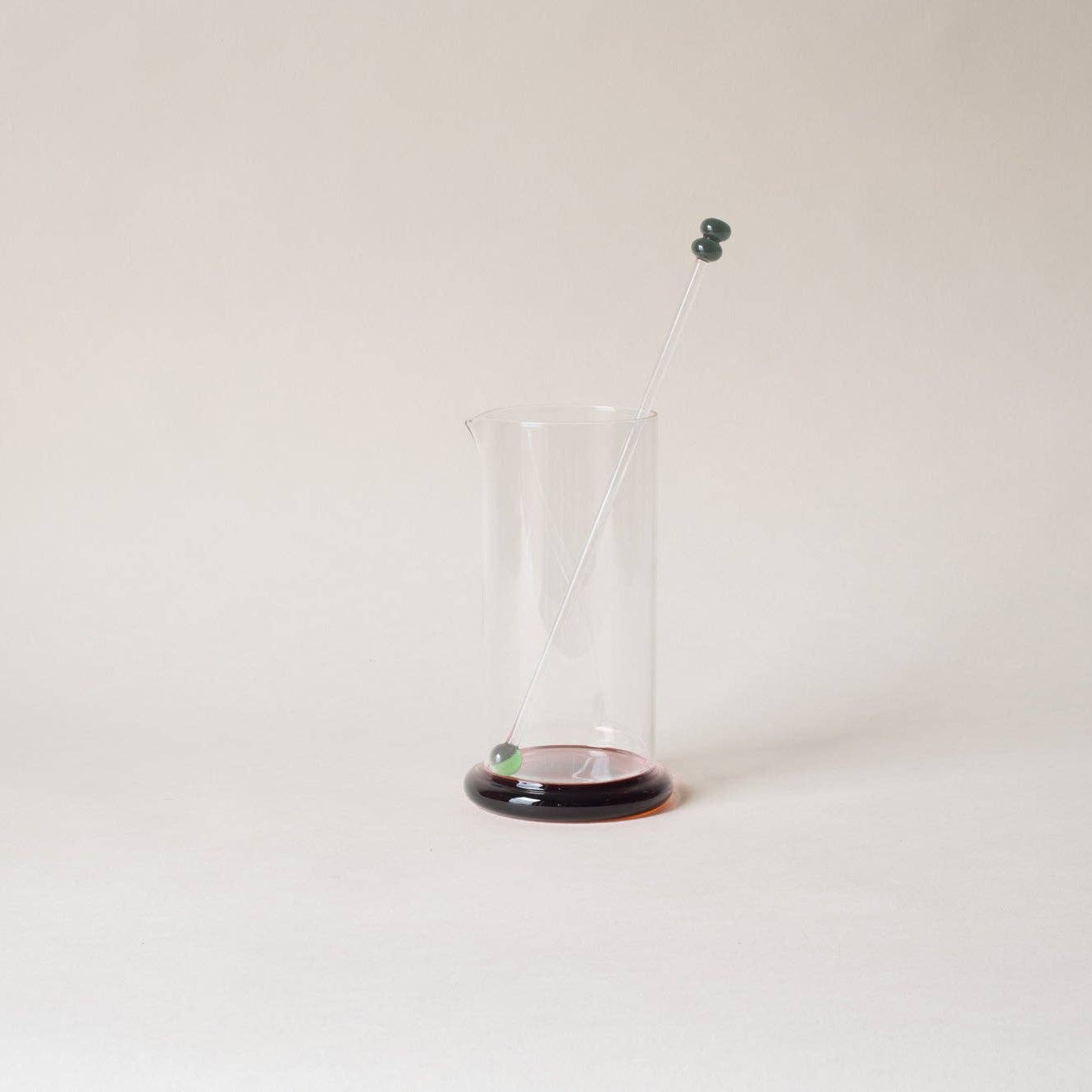 A borosilicate glass mixer, with a heavy, colorful base and contrasting stir stick. Perfect for making cocktails, juices, or as a simple pitcher.