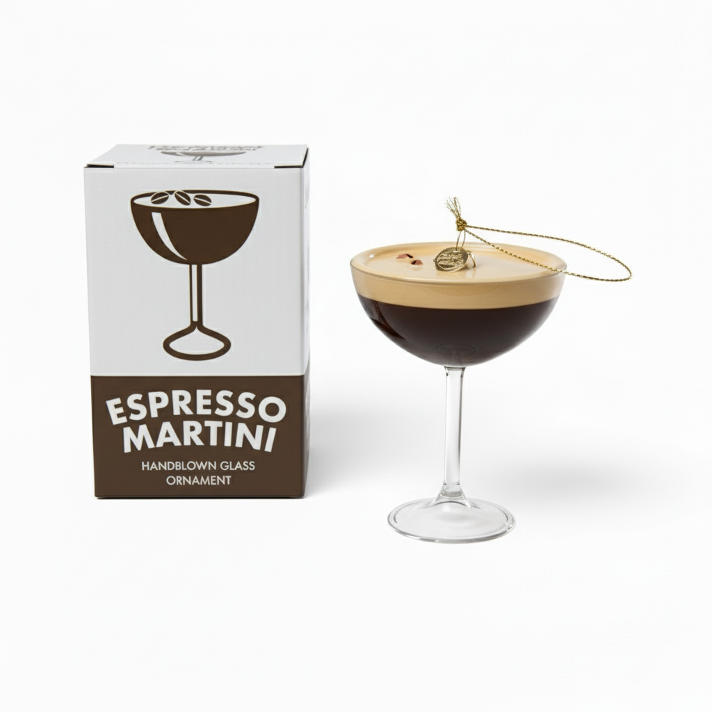 Deck the halls with ice-cold Espresso Martinis. ‘Tis the season to celebrate your evergreen love of frosty *caffeinated* Martinis, now in ornament form. Each hand-blown glass cocktail ornament features a classic stemmed coupe, with hand-painted details like a coffee bean garnish.