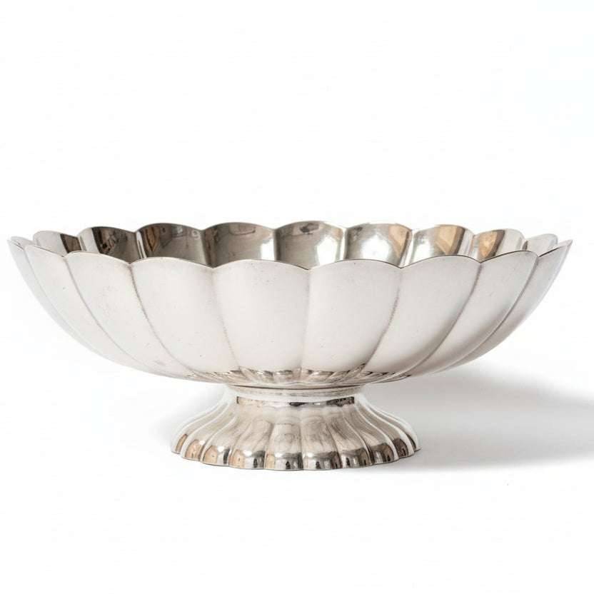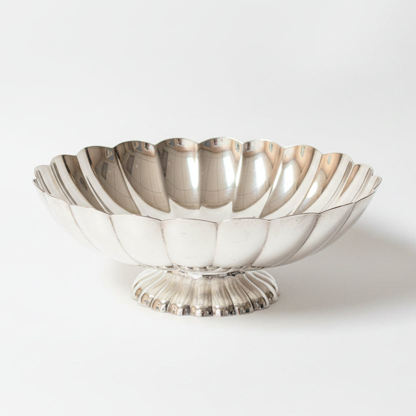 Oversized vintage silverplate footed bowl. Food safe for serving and we also love this for an Ikebana flower arrangement (flower frog needed). 12" across and 4.5" tall.