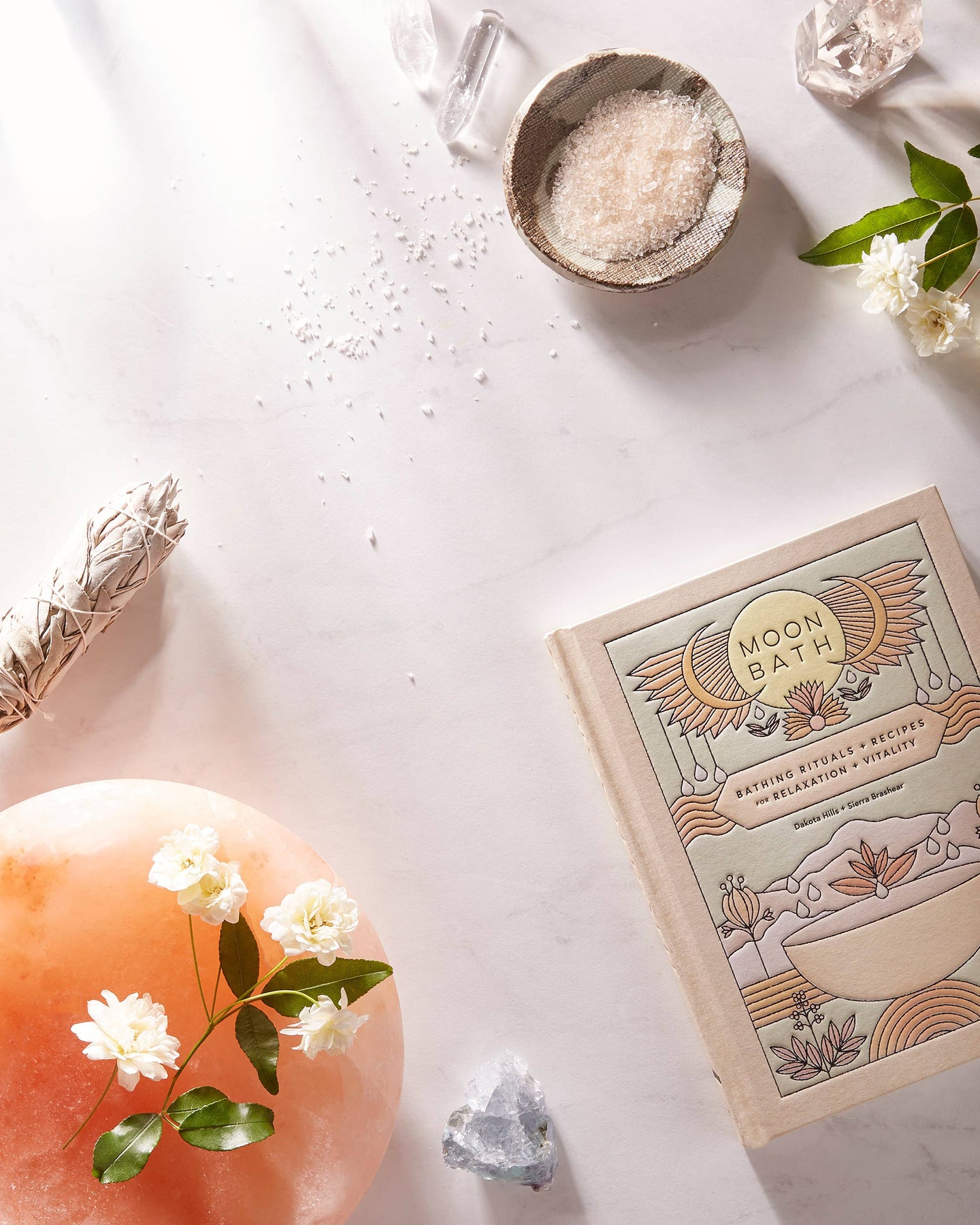 Organized by moon cycle—New Moon, Waxing Moon, Full Moon, and Waning Moon—each ritual includes a bath recipe featuring healing natural ingredients.