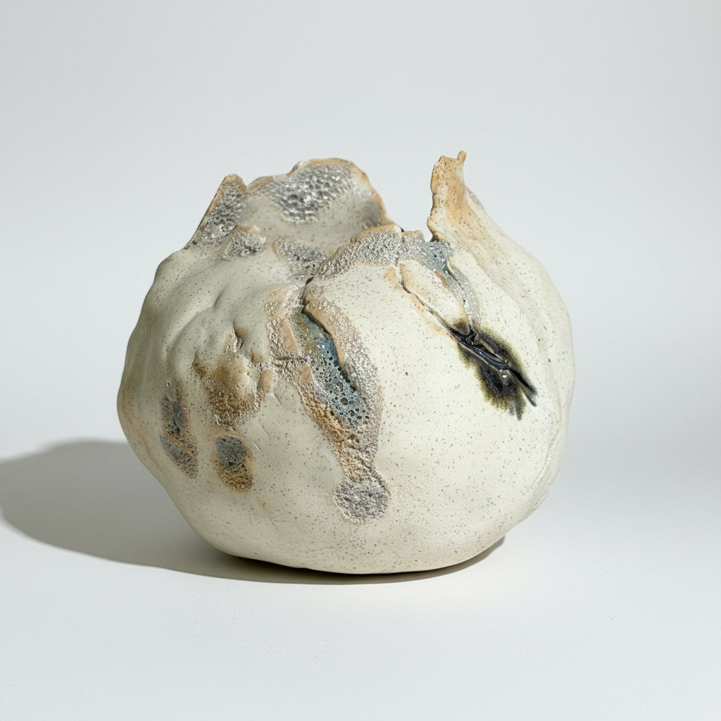 Handbuilt porcelain vessels exploring themes of resilience and self-healing. Each piece is made from the excavated interior of the previous one, featuring unique imperfections from repaired lesions that are healed only from within. Can be used with a flower frog to hold flowers.