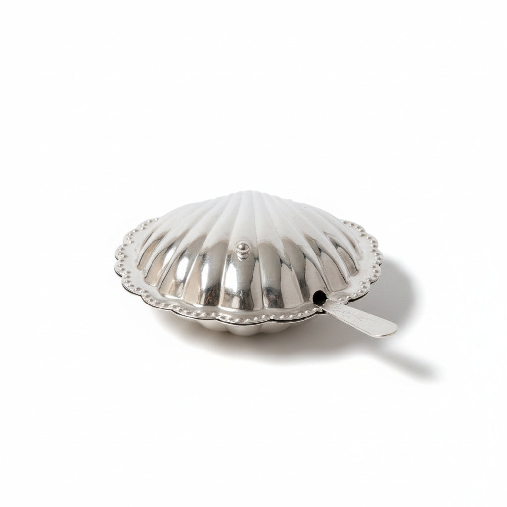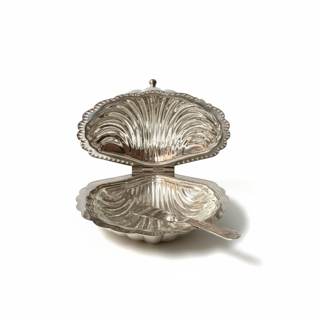 Vintage silver plate shell dish with removable glass insert and butter spreader!  Can also be used for caviar if the knife is replaced with a mother of pearl spoon.